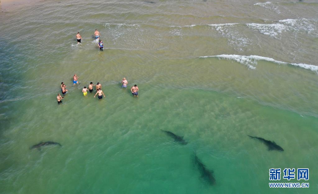 4月20日,在以色列北部城市哈代拉的海邊,鯊魚從人們身邊游過(無人機(jī)照片)。