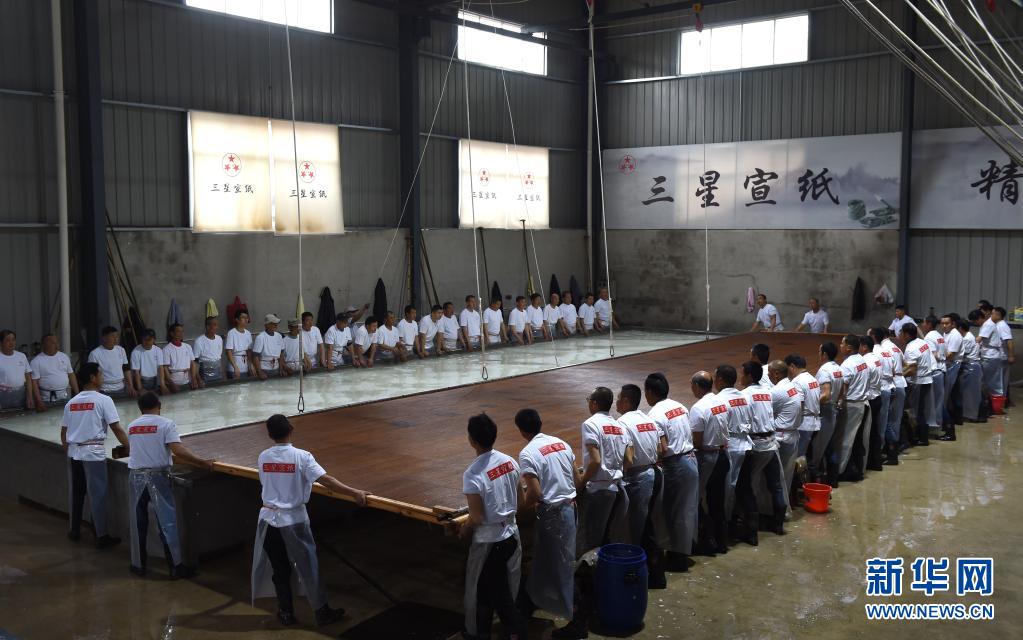 近日,在宣紙產(chǎn)地安徽省宣城市涇縣,“四丈宣紙”的抄制在一家紙業(yè)有限公司啟動(dòng)。50余名撈紙師傅操作巨型紙簾,齊心協(xié)力,在紙槽旁進(jìn)行撈紙作業(yè)。來回起落兩次,動(dòng)作整齊劃一。隨后工人們將紙簾吊起放至一邊揭下,一張巨大的宣紙便撈制成功。經(jīng)過曬、剪等工序后, 制成長(zhǎng)13.2米、寬3.6米的巨型宣紙就是“四丈宣紙”。