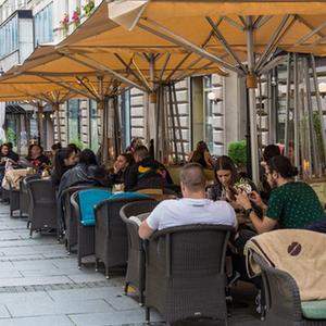 5月31日,在塞爾維亞貝爾格萊德,人們在一家餐廳的室外餐區(qū)用餐。