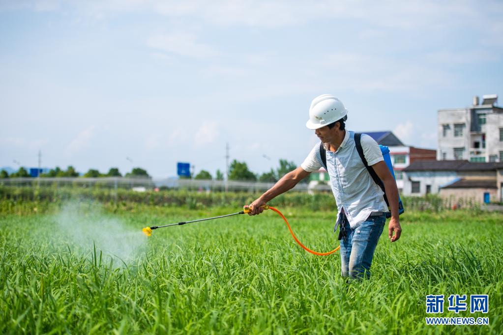 6月26日,湖南瀏陽(yáng)龍伏鎮(zhèn)新開(kāi)村村民在田間打藥。