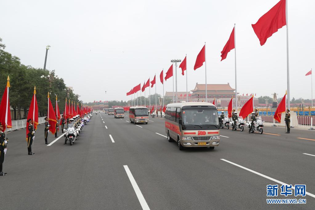 6月29日,慶祝中國共產(chǎn)黨成立100周年“七一勛章”頒授儀式在北京人民大會堂金色大廳隆重舉行。這是“七一勛章”獲得者集體乘坐禮賓車,由國賓護衛(wèi)隊護衛(wèi)前往人民大會堂。新華社記者 丁海濤 攝