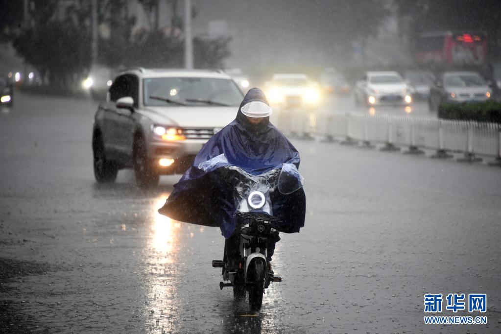 7月12日, 在北京市海淀區(qū)北三環(huán)西路,市民在雨中騎行。