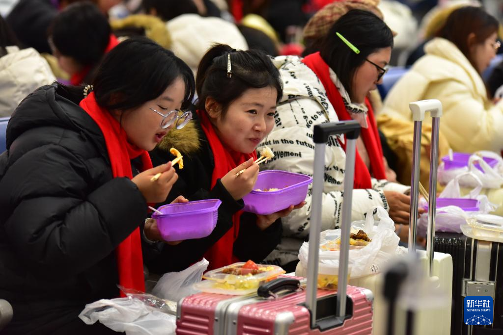 1月19日,大学生们在安徽阜阳西站候车大厅吃暖心餐。
