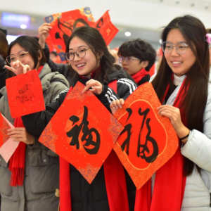 1月19日,在安徽阜阳西站候车大厅,大学生们参加“一城暖阳·温暖回家路”活动。