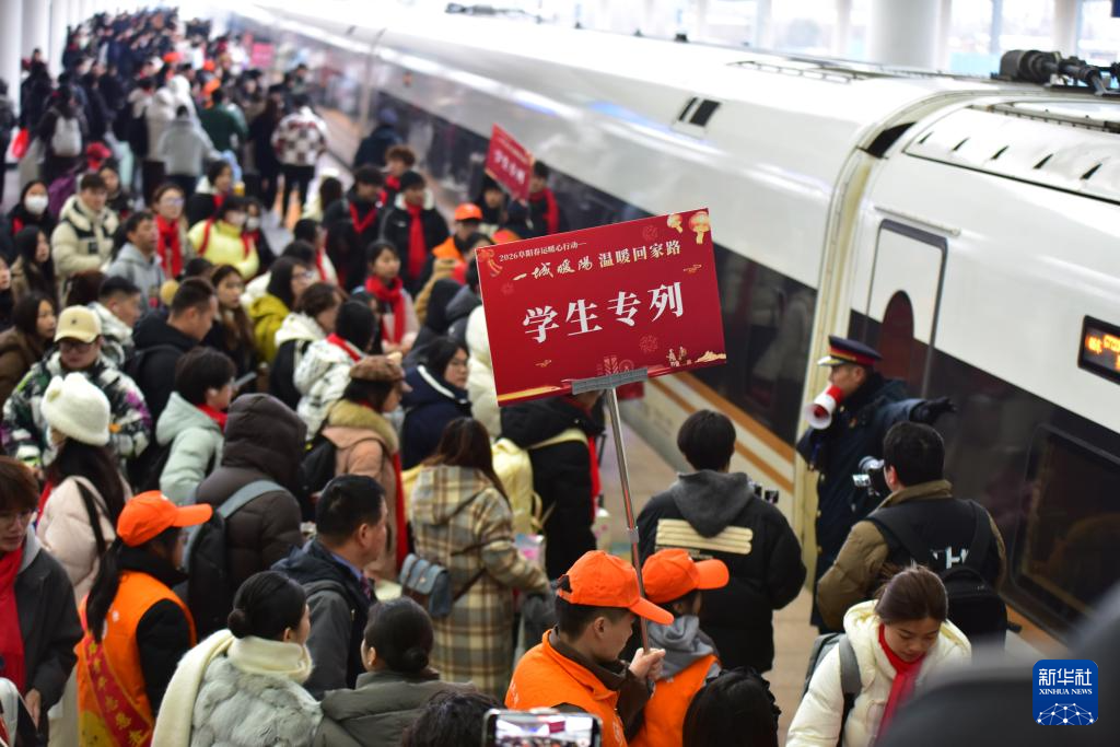 1月19日,G7723次列车从安徽阜阳西站驶出,300余名阜阳高校学子搭乘这趟列车开启寒假回家之旅。这是2026年长三角首趟学生团体包车。