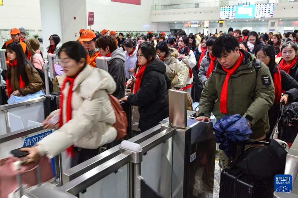 1月19日,在安徽阜阳西站,乘坐团体包车的大学生通过闸机检票进站。
