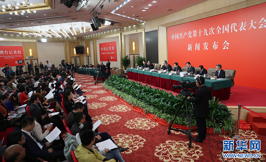 10月26日上午10:00,中國共產(chǎn)黨第十九次全國代表大會新聞發(fā)言人在梅地亞賓館二層新聞發(fā)布廳召開專題新聞發(fā)布會,請有關(guān)方面負(fù)責(zé)人解讀十九大報告,并回答記者關(guān)心的問題。圖為新聞發(fā)布會現(xiàn)場。新華網(wǎng) 翟子赫 攝