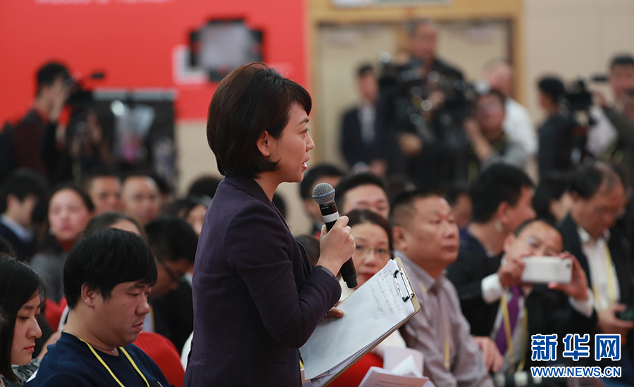 10月26日上午10:00,中國共產(chǎn)黨第十九次全國代表大會新聞發(fā)言人在梅地亞賓館二層新聞發(fā)布廳召開專題新聞發(fā)布會,請有關方面負責人解讀十九大報告,并回答記者關心的問題。圖為中央電視臺記者提問。新華網(wǎng) 翟子赫 攝