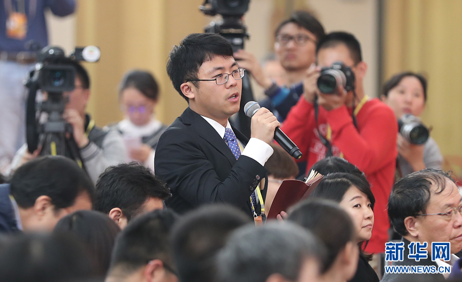 10月26日上午10:00,中國共產(chǎn)黨第十九次全國代表大會新聞發(fā)言人在梅地亞賓館二層新聞發(fā)布廳召開專題新聞發(fā)布會,請有關(guān)方面負(fù)責(zé)人解讀十九大報(bào)告,并回答記者關(guān)心的問題。圖為中國日報(bào)記者提問。新華網(wǎng) 王成云 攝