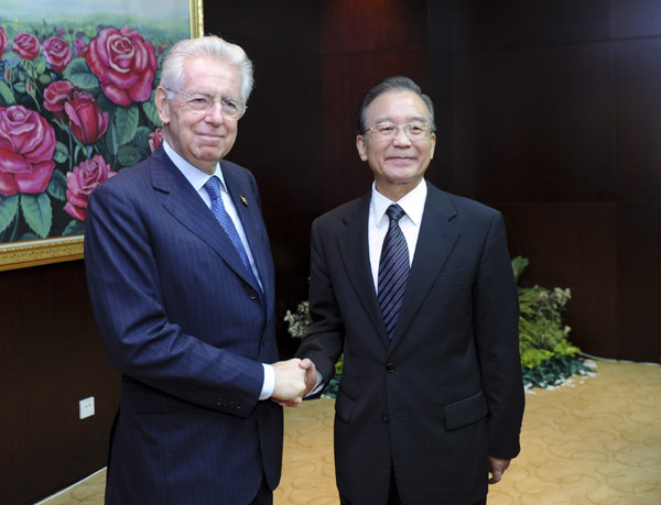 ??? 11月5日,國務(wù)院總理溫家寶在老撾首都萬象會見出席第九屆亞歐首腦會議的意大利總理蒙蒂。 新華社記者張鐸攝