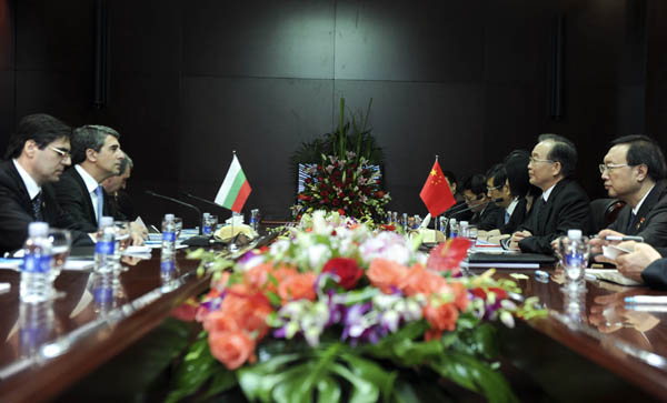 ??? 11月5日,中國國務(wù)院總理溫家寶在老撾首都萬象會(huì)見出席第九屆亞歐首腦會(huì)議的保加利亞總統(tǒng)普列夫內(nèi)利耶夫。 新華社記者張鐸攝