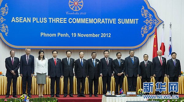 ????新華網(wǎng)金邊11月19日電(記者劉華 馮堅 王其冰)東盟與中日韓(10+3)合作15周年紀(jì)念峰會19日在柬埔寨金邊舉行。中國國務(wù)院總理溫家寶與東盟十國、日本、韓國領(lǐng)導(dǎo)人共同出席。柬埔寨首相洪森主持會議。