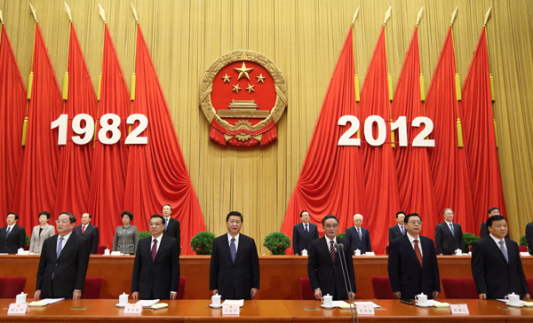??? 12月4日,首都各界在北京人民大會堂集會,隆重紀念現(xiàn)行憲法公布施行三十周年。習近平、吳邦國、李克強、張德江、俞正聲、劉云山等出席大會。新華社記者蘭紅光攝