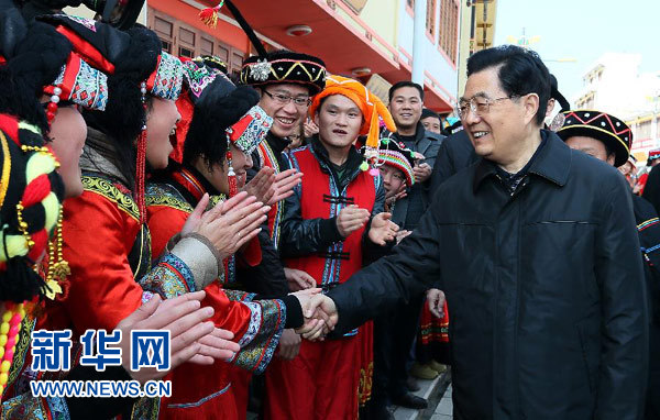 ????12月1日至6日,國家主席胡錦濤在貴州考察工作。這是胡錦濤在畢節(jié)市普底彝族小鎮(zhèn)向各族群眾親切致意。 新華社記者 鞠鵬 攝