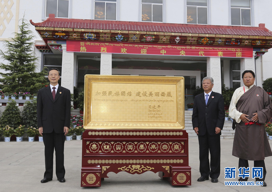 ??? 9月9日至10日,中央書記處書記、全國政協(xié)副主席、中央代表團副團長杜青林率林芝分團,帶著以習近平同志為總書記的黨中央對西藏各族人民的深切關(guān)懷和全國人民的美好祝福,看望慰問當?shù)馗髯甯刹咳罕姟_@是9月10日,杜青林向林芝市贈送習近平總書記題詞“加強民族團結(jié) 建設(shè)美麗西藏”賀匾。 新華社記者丁林攝