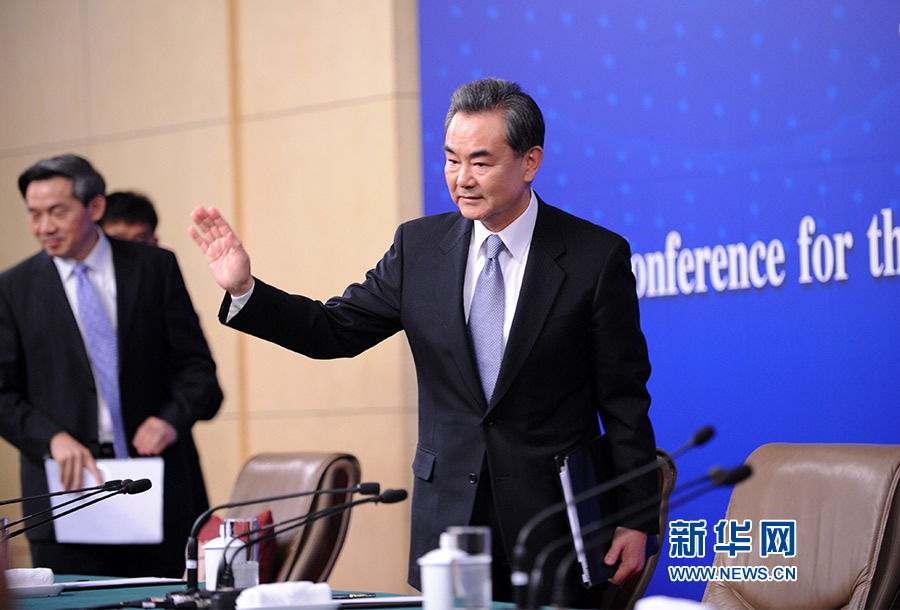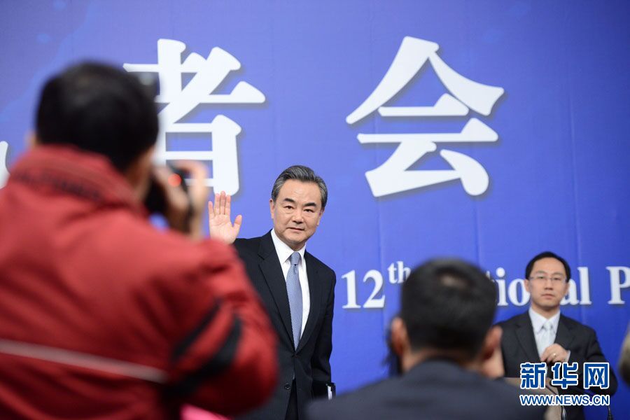 ????十二屆全國人大三次會(huì)議新聞中心于3月8日(星期日)10時(shí)在梅地亞中心多功能廳舉行記者會(huì),邀請外交部部長王毅就中國的外交政策和對外關(guān)系相關(guān)問題回答中外記者提問。圖為外交部部長王毅同記者揮手道別。新華網(wǎng)/中國政府網(wǎng) 翟子赫 攝