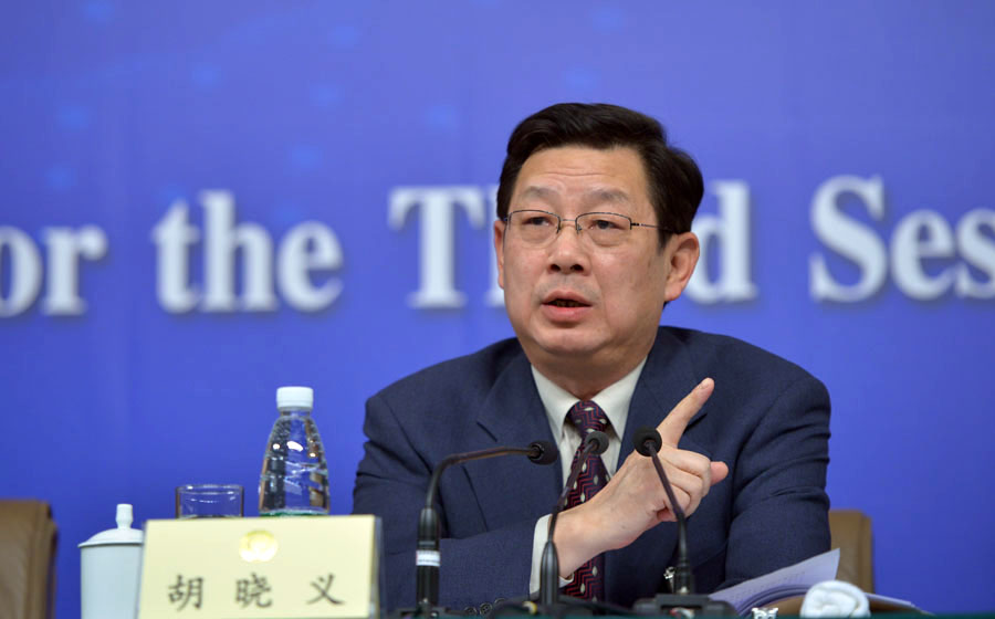 ??? 全國政協(xié)十二屆三次會議舉行記者會,邀請全國政協(xié)常委朱維群、黃潔夫和全國政協(xié)委員胡曉義、李彥宏、俞敏洪等談促進(jìn)民生改善與社會和諧穩(wěn)定,并回答記者提問。圖為胡曉義答記者問。新華網(wǎng)/中國政府網(wǎng) 郭小天 攝