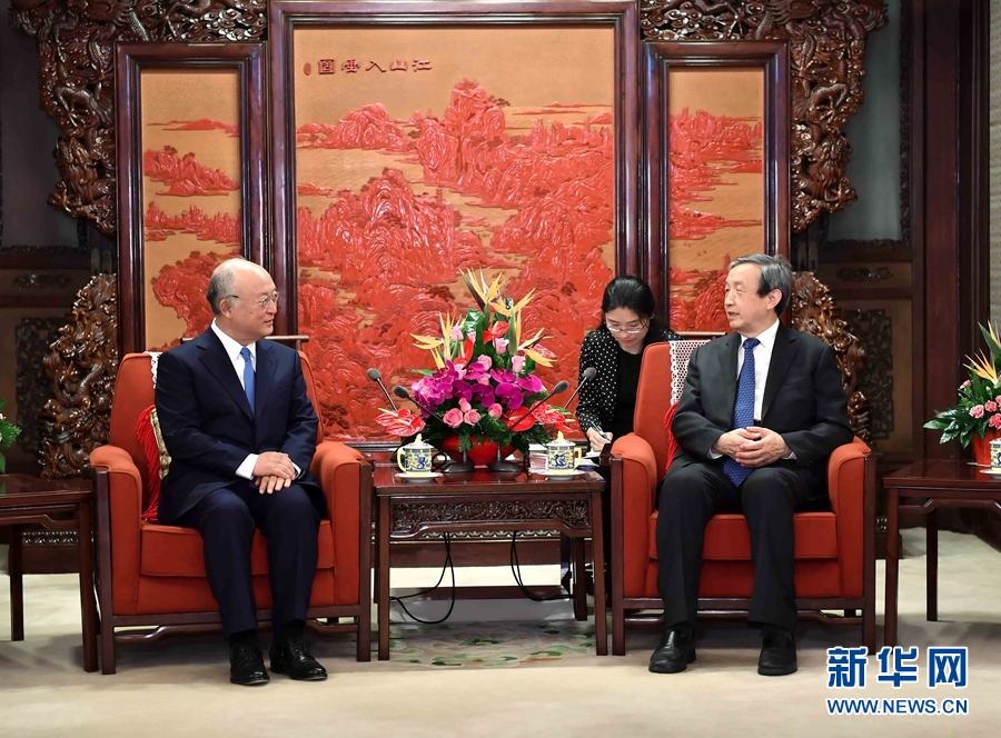 4月6日,國務(wù)院副總理馬凱(右)在北京中南海紫光閣會見國際原子能機構(gòu)總干事天野之彌(左)一行。 新華社記者 李濤 攝
