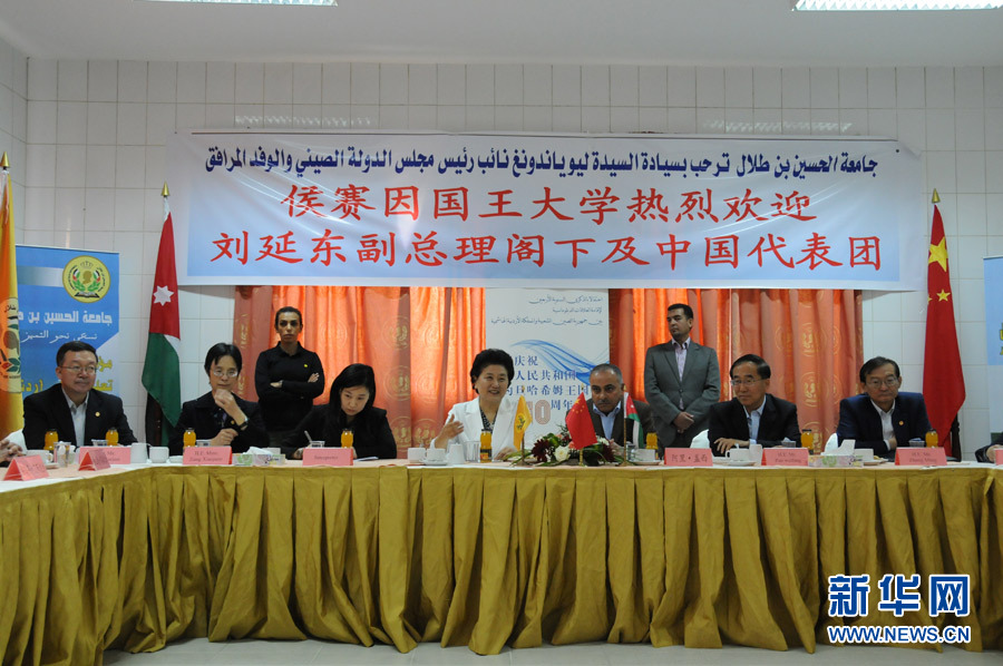 4月21日,在約旦佩特拉,中國國務(wù)院副總理劉延?xùn)|(中)訪問約旦侯賽因國王大學(xué)。 新華社記者林曉蔚攝