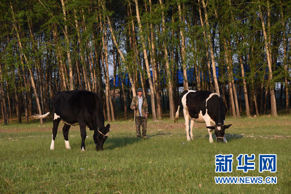 6月14日,黑龍江省龍江縣哈拉海鄉(xiāng)西里村貧困戶(hù)龍雙山趕著牛吃草。新華社記者 王建 攝