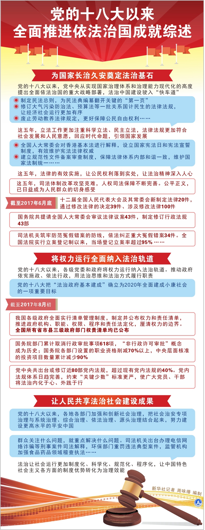 這五年,是全面依法治國實(shí)現(xiàn)歷史性突破的五年,是法治領(lǐng)域改革集中發(fā)力、成效顯著的五年。一幅“科學(xué)立法、嚴(yán)格執(zhí)法、公正司法、全民守法”的宏偉圖景,在神州大地壯闊展開。