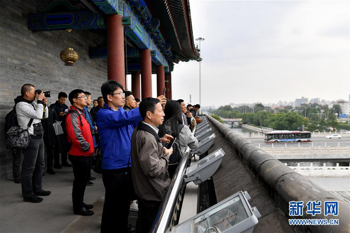 10月12日,記者團(tuán)在北京永定門城樓上參觀。新華社記者 李鑫 攝