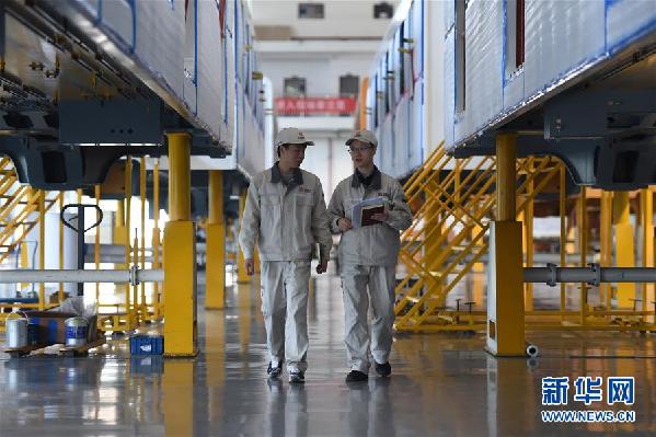 姚鴻洲(右)與同事在車間里從兩列正在實施組裝作業(yè)的車廂間走過(10月31日攝)。新華社記者 唐奕 攝