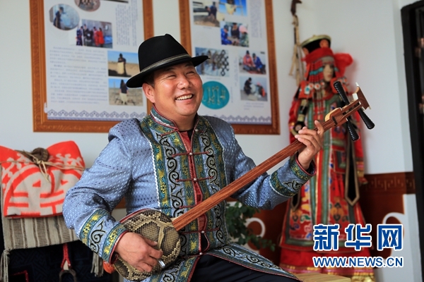內(nèi)蒙古鄂爾多斯市鄂托克前旗昂素鎮(zhèn)牧民、黨員中心戶孟克巴雅爾為游客彈唱蒙古族“祝酒歌”(11月6日攝)。新華社記者 王婧嬙 攝