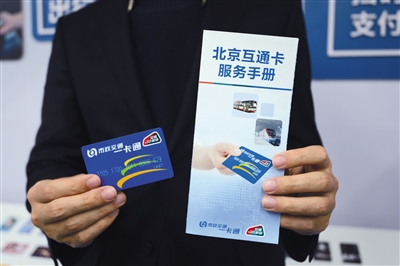昨日,工作人員在展示京津冀互通卡?;ネ嬗疑辖怯∮小敖煌?lián)合”標(biāo)識(shí)。 北京市政交通一卡通有限公司供圖