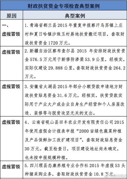 “發(fā)現(xiàn)一起、查處一起、絕不姑息!”財(cái)政部監(jiān)督檢查局有關(guān)負(fù)責(zé)人指出,此次檢查發(fā)現(xiàn)了一批違法違規(guī)問題,本著“零容忍”態(tài)度已進(jìn)行了嚴(yán)肅處理。從檢查發(fā)現(xiàn)問題中的一些典型案例看,虛報(bào)冒領(lǐng)、擠占挪用、違規(guī)招投標(biāo)、盲目決策導(dǎo)致資金大量浪費(fèi)、精準(zhǔn)扶貧貫徹落實(shí)不到位是當(dāng)前濫用扶貧資金的主要問題所在。