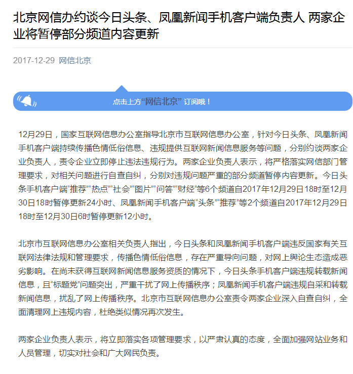 原標題:北京網(wǎng)信辦約談今日頭條、鳳凰新聞手機客戶端負責人 兩家企業(yè)將暫停部分頻道內(nèi)容更新