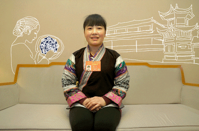 ??? ——全國(guó)人大代表蔡群在老家貴州畢節(jié)織金縣官寨鄉(xiāng)大寨村苗寨開(kāi)了一家苗族蠟染刺繡公司,帶動(dòng)寨子里300多名外出打工的婦女一起回鄉(xiāng)創(chuàng)業(yè)。