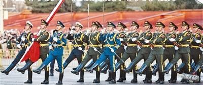 7時(shí)33分,編隊(duì)走出金水橋,齊步換正步行進(jìn)。3名分隊(duì)長(zhǎng)拔刀出鞘,行舉刀禮。同一時(shí)間,90名隊(duì)員由肩槍換為端槍?zhuān)淝靶小?/p>