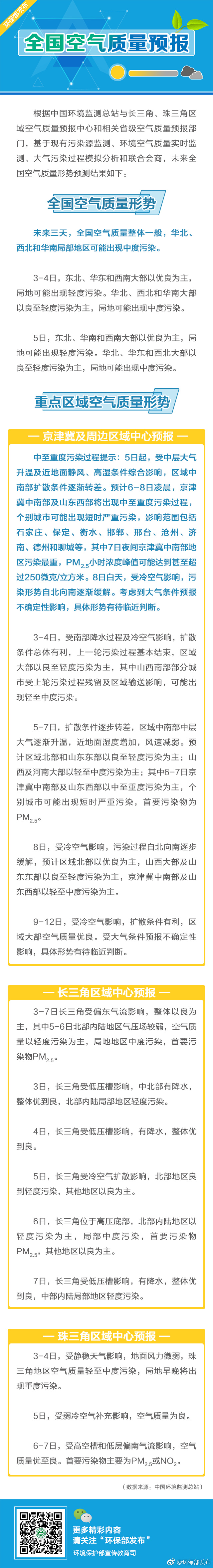 據(jù)環(huán)境保護部宣傳教育司官方微博消息,未來三天(1月3日-5日),全國空氣質(zhì)量整體一般,華北、西北和華南局部地區(qū)可能出現(xiàn)中度污染。5日起,京津冀及周邊區(qū)域中南部擴散條件逐漸轉(zhuǎn)差。預(yù)計6-8日凌晨,京津冀中南部及山東西部將出現(xiàn)中至重度污染過程,個別城市可能出現(xiàn)短時嚴(yán)重污染,其中7日夜間中南部地區(qū)污染最重。8日白天,受冷空氣影響,污染形勢自北向南逐漸緩解。
