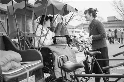 應(yīng)聘成功后,經(jīng)過(guò)前期培訓(xùn),王雪宜1月1日正式上崗。聊起這幾天的收獲,她表示,這里依舊有許多老北京的影子,而蹬車(chē)的大爺們不僅騎車(chē)騎得溜,還能講好幾國(guó)語(yǔ)言。