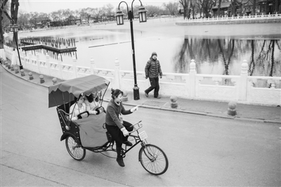 1月4日,北京什剎海景區(qū),車(chē)隊(duì)為每一個(gè)游客都準(zhǔn)備了毯子御寒。圖為王雪宜為兩名年輕游客鋪完毯子后交流今天的行程路線。