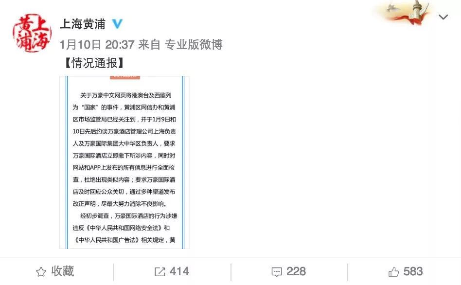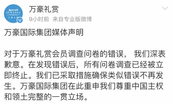 我們已采取措施確保類似錯(cuò)誤不再發(fā)生。萬豪國際集團(tuán)在此重申我們尊重中國主權(quán)和領(lǐng)土完整的一貫立場。