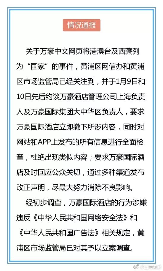 經(jīng)初步調(diào)查,萬豪國際酒店的行為,涉嫌違反《中華人民共和國網(wǎng)絡(luò)安全法》和《中華人民共和國廣告法》相關(guān)規(guī)定,黃浦區(qū)市場監(jiān)管局已對其予以立案調(diào)查。
