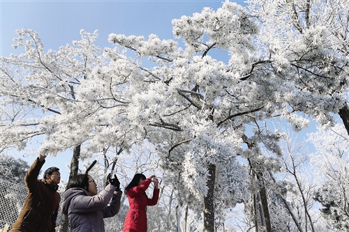 1月23日,游人在濟(jì)南跑馬嶺景區(qū)觀賞霧凇美景。當(dāng)日,受持續(xù)大霧天氣和強(qiáng)冷空氣的影響,濟(jì)南跑馬嶺景區(qū)出現(xiàn)霧凇景觀。呂傳泉攝(新華社 發(fā))