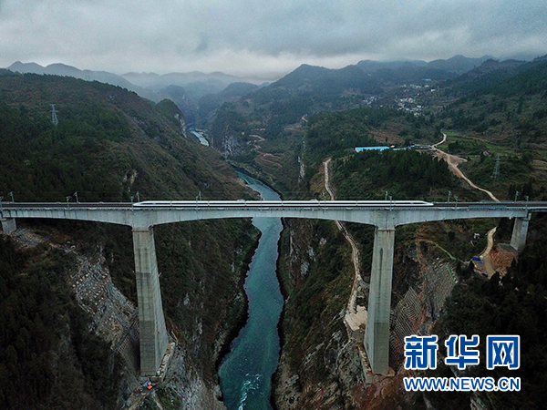 1月25日,渝貴鐵路從貴陽(yáng)北到重慶西的D8592次首發(fā)動(dòng)車經(jīng)過(guò)遵義市境內(nèi)的烏江大橋。新華社記者 劉續(xù)攝