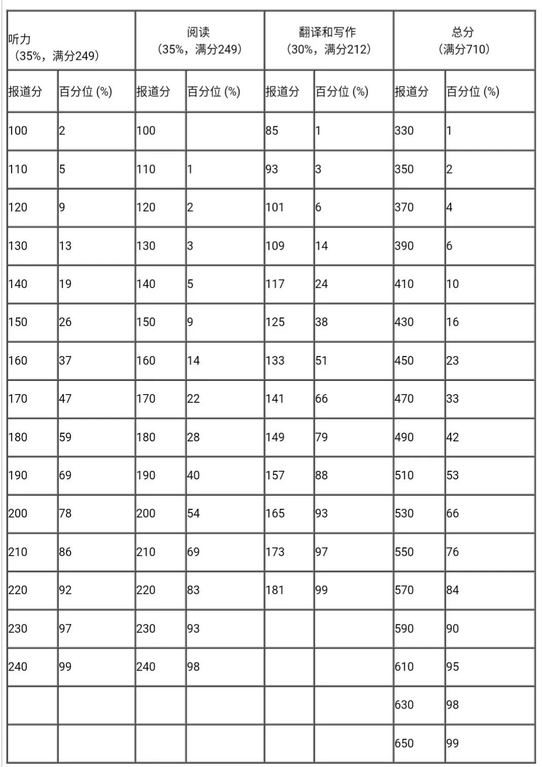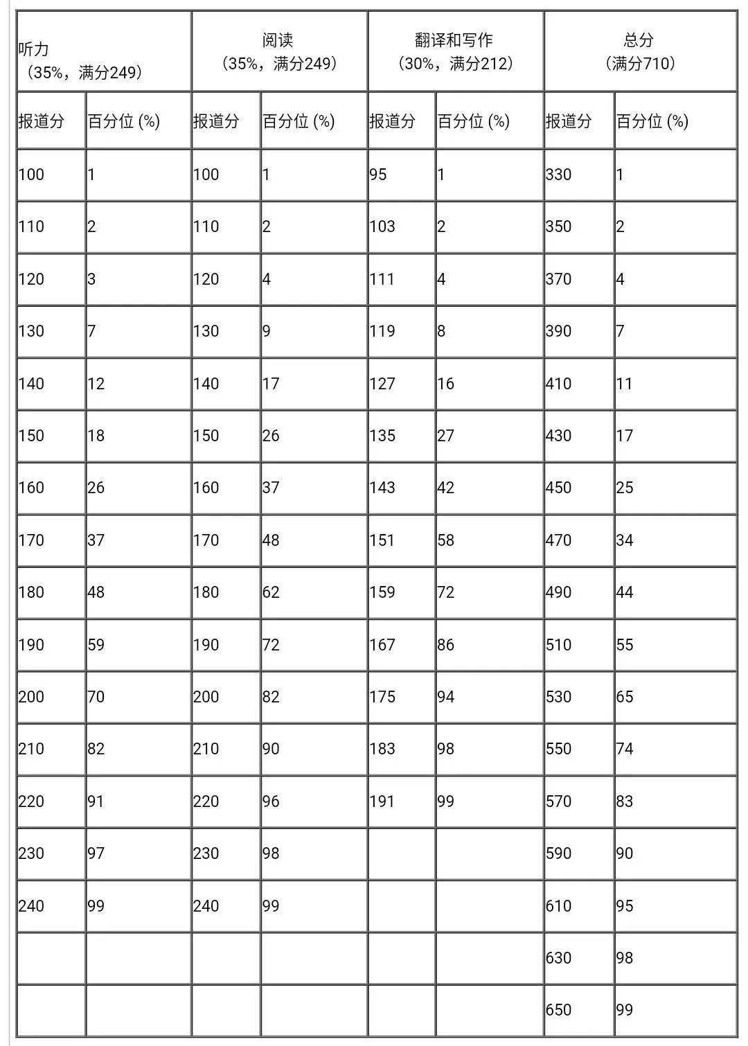 每次考試等值后的卷面分?jǐn)?shù)都參照常模轉(zhuǎn)換為報(bào)道分。四、六級(jí)考試報(bào)道總分為710分,計(jì)算公式為: