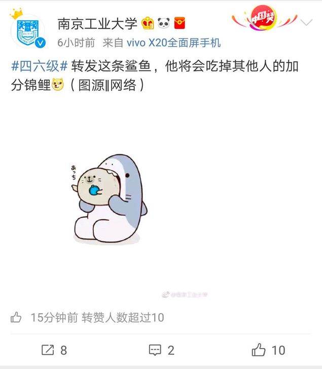 然而!南京工業(yè)大學(xué)官方微博不走尋常路,轉(zhuǎn)發(fā)鯊魚(yú),吃掉其他人的錦鯉: