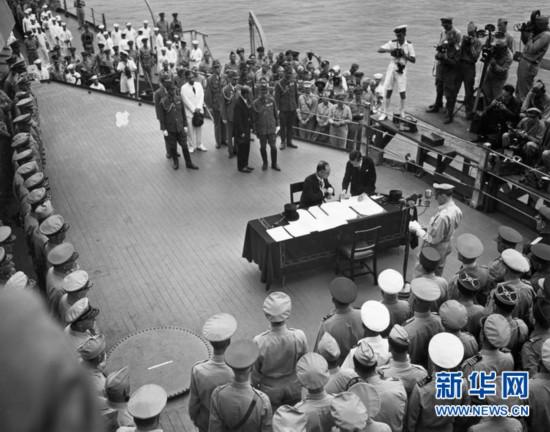 圖示:1945年9月2日,日本外相重光葵代表日本天皇和政府在投降書上簽字