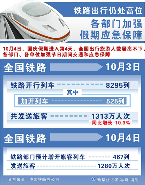 記者從中國(guó)鐵路總公司獲悉,3日,全國(guó)鐵路開(kāi)行列車(chē)8295列,其中加開(kāi)列車(chē)525列,共發(fā)送旅客1313萬(wàn)人次,同比增長(zhǎng)10.3%。4日,全國(guó)鐵路客流略有回落但仍持續(xù)高位運(yùn)行,鐵路部門(mén)預(yù)計(jì)增開(kāi)旅客列車(chē)467列,發(fā)送旅客1280萬(wàn)人次。哈爾濱局在管內(nèi)不通火車(chē)的57個(gè)市縣鎮(zhèn)開(kāi)通鐵路無(wú)軌站,采取公鐵聯(lián)運(yùn)方式,方便旅客出行。沈陽(yáng)局開(kāi)行多趟熱門(mén)方向中短途“秋游列車(chē)”,如沈陽(yáng)至大連的G8046次“賞菊專(zhuān)列”等。