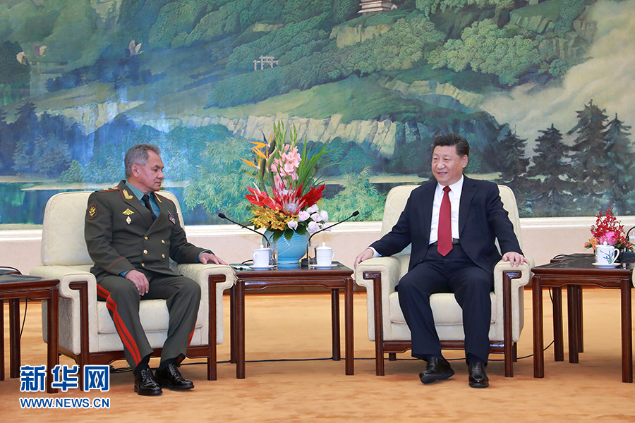 紹伊古首先轉達普京總統(tǒng)對習近平主席的親切問候。習近平表示感謝,并請紹伊古轉達對普京總統(tǒng)的誠摯問候和良好祝愿。