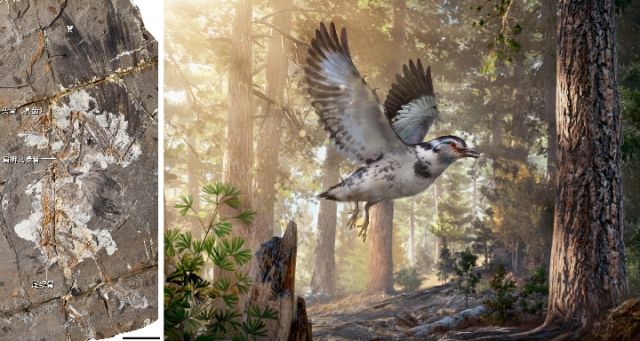 距今1.27億年前的原始鳥類迷惑巾幗鳥化石和復(fù)原圖。