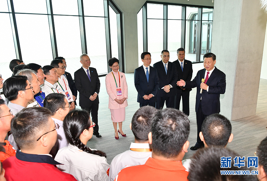 東人工島位于港珠澳大橋水上橋梁和水下隧道的銜接部分,是大橋建設中的關鍵節(jié)點工程。習近平等乘車來到這里,登上西側(cè)平臺眺望大橋,結(jié)合圖片、模型詳細了解大橋建設情況,并會見了大橋管理和施工等方面的代表,同他們一一握手、親切交談。他指出,港珠澳大橋是國家工程、國之重器。你們參與了大橋的設計、建設、運維,發(fā)揮聰明才智,克服了許多世界級難題,集成了世界上最先進的管理技術和經(jīng)驗,保質(zhì)保量完成了任務,我為你們的成就感到自豪,希望你們重整行裝再出發(fā),繼續(xù)攀登新的高峰。