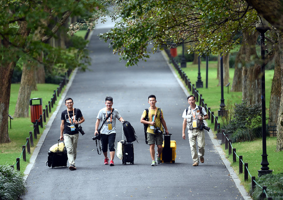 圖為金立旺(左一)2016年9月4日在西湖蘇堤準(zhǔn)備采訪G20峰會(huì)。
