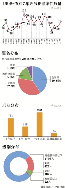 昨天上午,北京一中院發(fā)布《1995年-2018年職務(wù)犯罪白皮書》(以下簡稱白皮書)。作為承擔了北京近四成的職務(wù)犯罪審判任務(wù)的法院,23年來,一中院通過審理的1800余件職務(wù)犯罪案件,總結(jié)出了該類案件的主要特征和發(fā)展趨勢。近年來,職務(wù)犯罪中“小官”犯罪占比較高、犯罪行為時間跨度平均為7年,“初犯”低齡化職務(wù)犯罪特征初顯等。