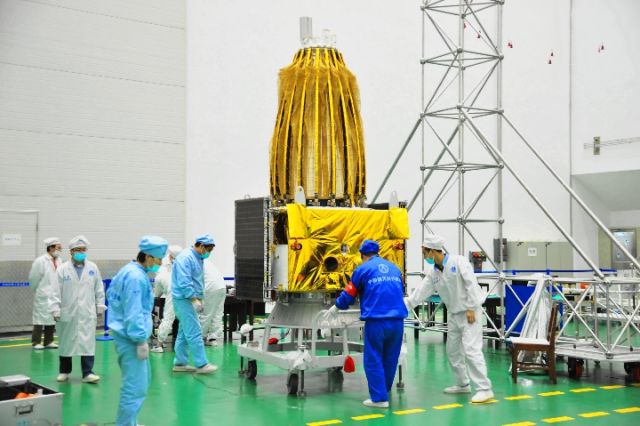 發(fā)射前的鵲橋號(hào)中繼衛(wèi)星。(中國(guó)航天科技集團(tuán)五院供圖)
